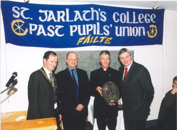 Pictured, left to right: Richard Hughes (President, St Jarlath's P.P.U.),Gerry Buckley (Author, 'Fifty Years of the Hogan Cup'), Fr Conal Eustace (President, St Jarlath's College), Michael Lyster RTÉ's own 'Tuam Sham', Compere. Father Eustace: 'Lads, is that 'Scan' Concannon I see at the back of the hall?
